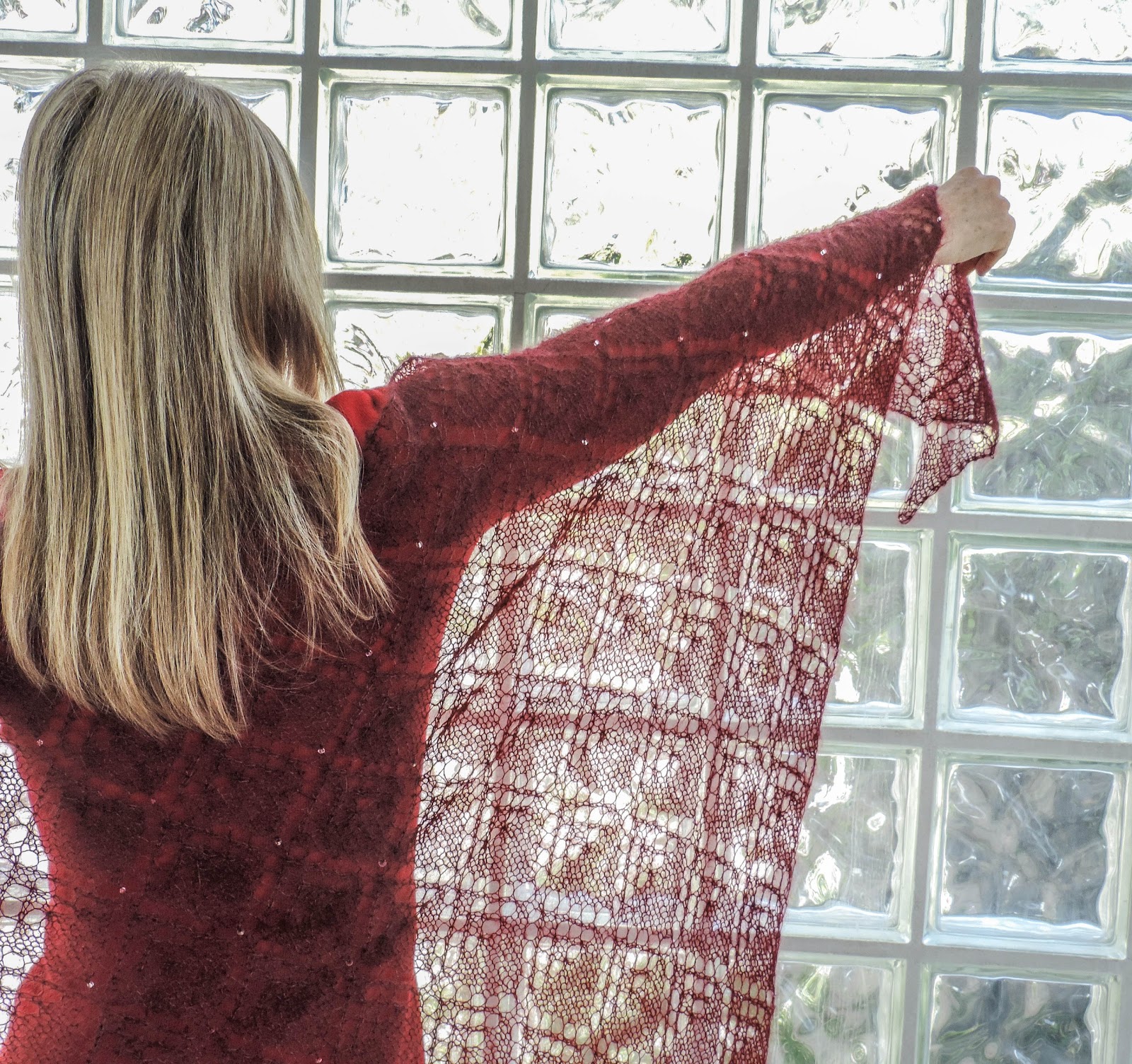 I knew this shawl would be worn at the holidays so I added a mixture of crystal and seed beads to add sparkle and catch the light. I began by using all crystal beads but ran short and when I reassessed the effect I added in colored seeds beads because I thought the contrasting beads added a more interesting effect. I love the finished shawl and can't wait to wear it when I make my appearance in the evenings. I just wish I had a crown and scepter to complete the effect.